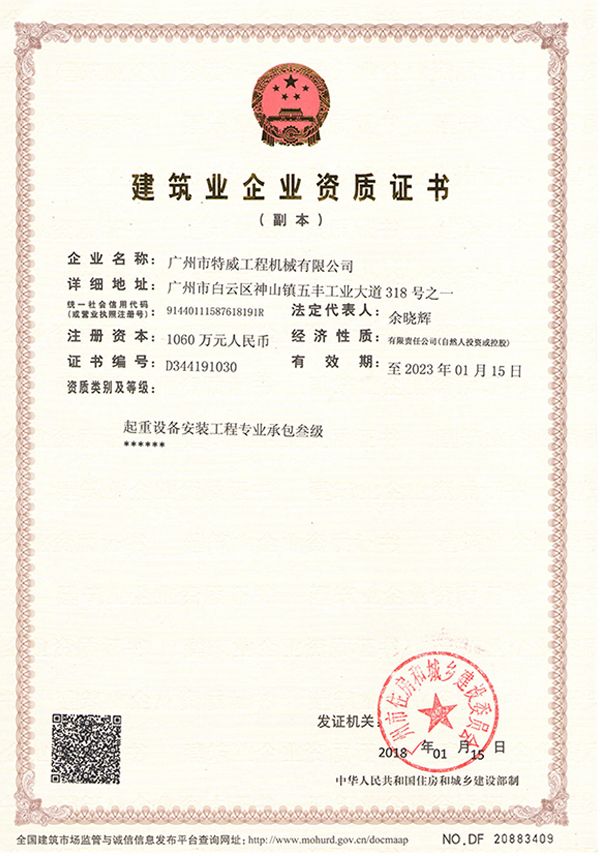 廣州市特威工程機(jī)械有限公司地處廣州市白云區(qū)神山鎮(zhèn),廣清高速神山出口附近,是一家施工升降機(jī)的專(zhuān)業(yè)生產(chǎn)廠(chǎng)家。公司成立于2011年,占地100000多平方米,注冊(cè)資金1060萬(wàn)元,現(xiàn)有員工300余人其中工程技術(shù)人員33人,高級(jí)技術(shù)人員52人。